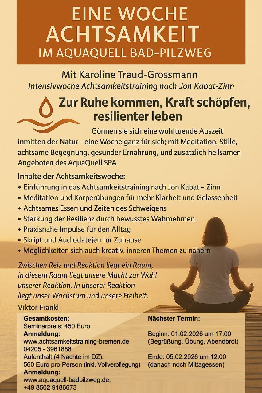 Meine Kurse unterstützen Sie dabei, den vielfältigen alltäglichen Stressfaktoren mit größerer Gelassenheit begegnen zu können. Sie werden über Achtsamkeitsübungen und Meditationen darin begleitet, mehr in Ihrer eigenen Mitte anzukommen…