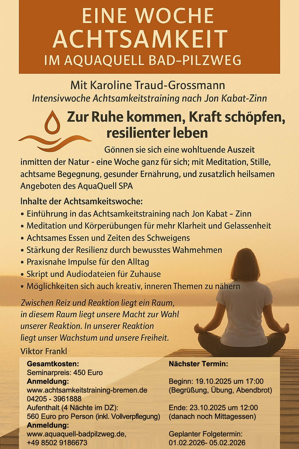 Meine Kurse unterstützen Sie dabei, den vielfältigen alltäglichen Stressfaktoren mit größerer Gelassenheit begegnen zu können. Sie werden über Achtsamkeitsübungen und Meditationen darin begleitet, mehr in Ihrer eigenen Mitte anzukommen…